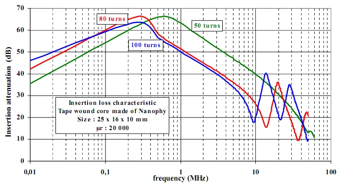 ![]() Figure 3: Insertion loss versus frequency in the case of a Common Mode Choke for RFI filter, with a magnetic nanocrystalline wound core made of Nanocrystalline - µr = 20 000 – and three possible numbers of turns | |||||||||||||||||||||||||||||||||||||||||||||||||||||||||||||||||||||||||||||||||
