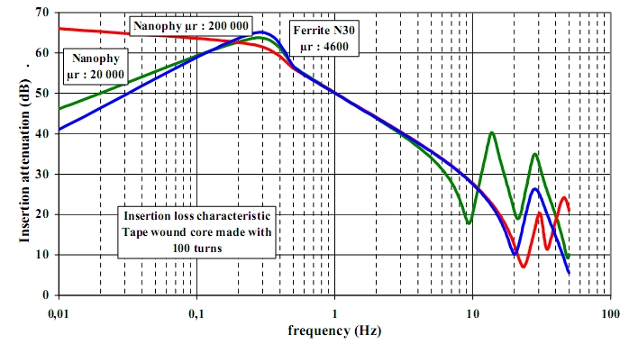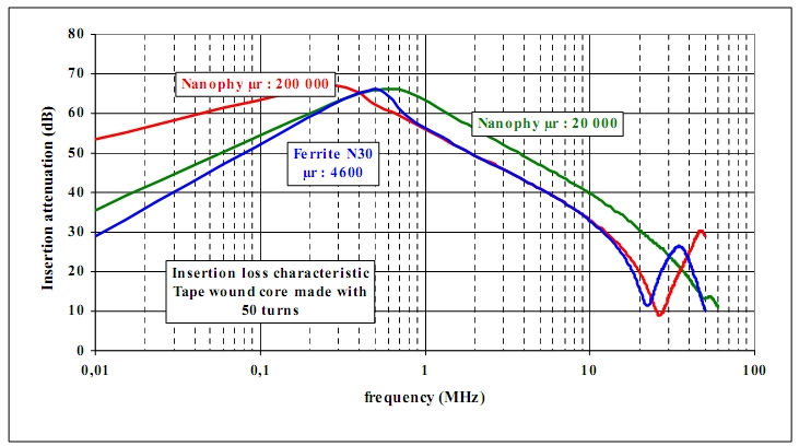 ![]() Figure 4: Insertion loss versus frequency in the case of a Common Mode Choke with 50 turns for RFI filter, with a magnetic core made of nanocrystalline wound - µr = 20 000 or µr = 200 000 – or N30 ferrite -µr = 4600. | |||||||||||||||||||||||||||||||||||||||||||||||||||||||||||||||||||||||||||||||||