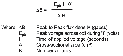 Since the volt-seconds (Et) during the "on" and "off" portion of a period must be equal in the steady state, the peak to peak flux density for a squarewave (which is not necessarily symmetric) is described by the following formula in cgs units: